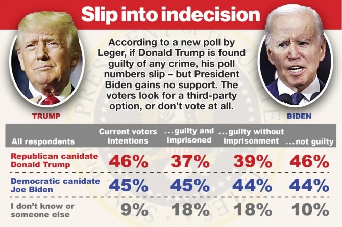 2일(이하 현지 시각) 뉴욕포스트에 따르면 여론조사업체 레저가 최근 미국 유권자를 대상으로 조사를 벌인 결과 트럼프에 대한 지지율은 46%, 바이든에 대한 지지율은 45%로 트럼프가 다소 앞선 가운데 총 88개에 달하는 범죄 혐의를 받고 있는 트럼프에게 유죄 선고가 내려져 수감될 경우 트럼프의 지지율은 37%로 내려가는 것으로 나타났다.