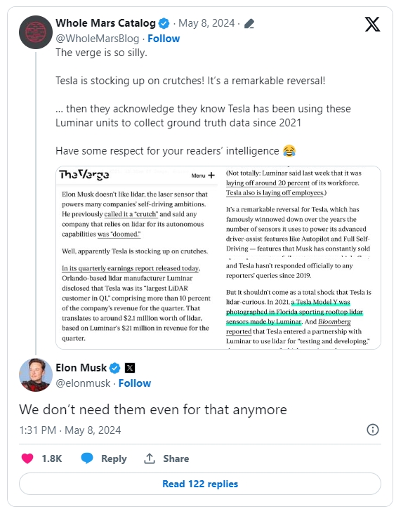 8일(이하 현지시각) 테슬라라티에 따르면 머스크는 이날 X에 올린 트윗에서 “지상 실측 정보를 확보하는 용도로도 라이다는 더 이상 필요가 없어졌다”고 밝혔다.