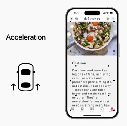 애플에 따르면 이 기능을 사용하면 차량에 타고 있는 사용자의 아이폰이나 아이패드 디스플레이의 가장자리에 차량의 움직임에 따라 움직이는 매우 작은 점들이 나타나 화면의 흔들림으로 인한 시각적인 불편함이 크게 줄어든다.