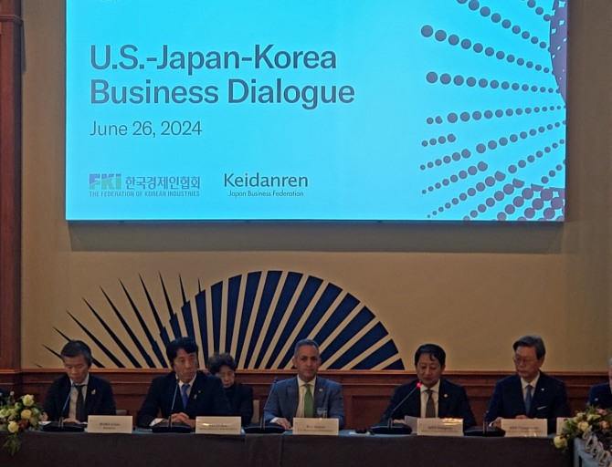 이미지 확대보기한·미·일 3국 대표 경제단체는 이날 민간 분야에서 3국 간 협력을 강화하기 위한 양해각서(MOU)를 체결하고, 협의체 모임을 정례화하기로 했다. 3국 경제단체들은 3국 경제계가 경제 안보와 기술 분야에서 삼각 협력을 강화하기로 했다. 또 '한·미·일 비즈니스 대화'의 연 1회 이상 정례화에 합의하고, 3국 정상 또는 정부 간 회의가 열릴 때 '한·미·일 비즈니스 대화'를 연계해 개최하기로 했다.