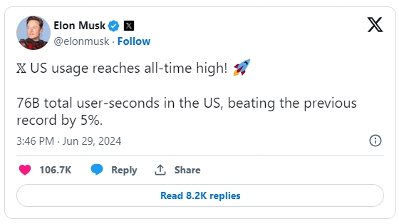 1일 소셜미디어 전문매체 소셜미디어투데이에 따르면 트럼프에 대한 지지 입장을 이미 천명한 바 있는 머스크는 지난달 29일 X에 올린 글에서 “바이든과 트럼프의 토론이 진행되고 있을 때 미국 지역의 X 사용자들이 X에 접속한 시간이 통산 76억초에 달해 사상 최고 기록을 세웠다고 밝혔다. 그는 “이는 종전 기록보다 5%나 많은 수치”라고 덧붙였다.