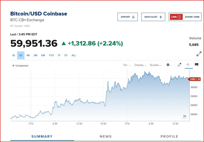 비트코인은 트럼프 전 대통령이 총격당했다는 소식에 순식간에 6만 달러선을 탈환했다. 비트코인이 6만 달러선에 오른 것은 지난 3일 이후 11일 만이다. 뉴욕증시에서는 비트코인 상승은 트럼프 전 대통령이 총격 사건으로 오는 11월 대선에서 승리할 가능성이 더 커졌다는 분석에 따른 것으로 풀이하고 있다. 뉴욕증시 블룸버그 통신은 "트럼프 전 대통령 유세에서 총격 사건이 발생한 후 비트코인이 상승세를 보이고 있으며, 이번 사건으로 트럼프의 대선 승리 가능성이 높아질 것이라는 추측이 나오고 있다"고 전했다.