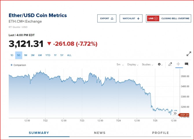 이미지 확대보기26일 뉴욕증시와 가상화폐 거래소 코인베이스에 따르면 이더리움 가격은 한때 8%이상 떨어졌다. 뉴욕증권거래소 등에서 현물 ETF가 거래를 시작한 지난 23일 3천500달러대에 근접했던 것에 비해 10% 넘게 떨어졌다. 이더리움의 낙폭은 시총 1위 비트코인보다 더 크다. 비트코인도 떨어지고 있다. 뉴욕증시에서는 9개 이더리움 현물 ETF가 상장되며 거래 첫날 총 1억달러가 넘는 자금이 순유입되기도 했지만 지금은 내려가는 양상이다.