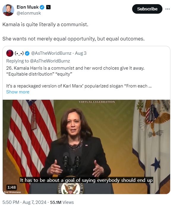 그는 해리스 부통령이 ‘평등(equality)’과 ‘공정(equity)’의 개념 차이를 설명하는 내용의 영상을 공유하면서 이같이 주장했다. 머스크는 해리스가 결과까지 평등할 수 있도록 하자는 것은 공산주의나 다름없다는 주장을 한 것으로 풀이된다.