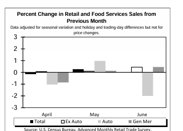 미국은 6월 소매 판매가 전달과 변동이 없었다고 발표했다. 또 자동차와 가스를 제외한 소매판매는 6월에 0.8% 증가하면서 경제학자들이 예상한 0.1% 증가도 넘어 예상보다 훨씬 큰 폭으로 증가했다.