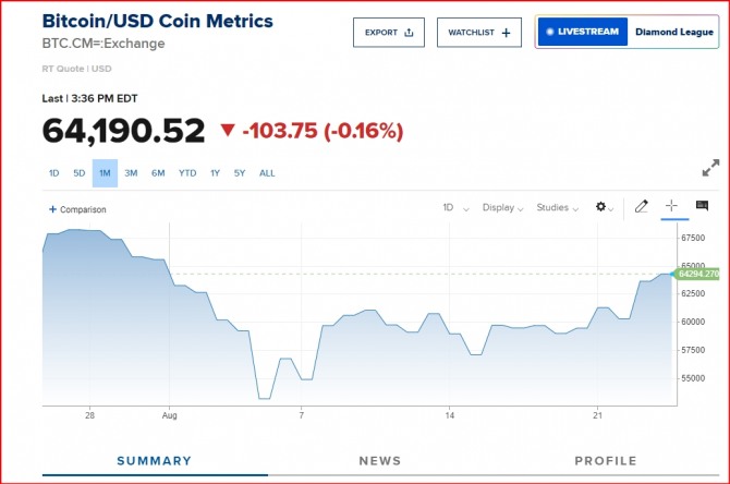 이미지 확대보기26일 뉴욕증시외 가상 암호화폐 업계에 따르면 미국 기준 금리 인하 기대감으로 큰 폭의 오름세를 보이던 비트코인이 하락세로 돌아섰다. 앞서 제롬 파월 연방준비제도(Fed·연준) 의장은 이날 잭슨홀 연설에서 “통화정책을 조정할 시기가 도래했다”며 9월 금리인하를 강하게 시사했다. 또 케네디 주니어 무소속 대선 후보가 선거 운동을 중단하고 공화당 대선 후보인 트럼프 전 대통령을 지지하기로 했다는 소식이 전해지면서 6만3000달러선도 넘어섰다.