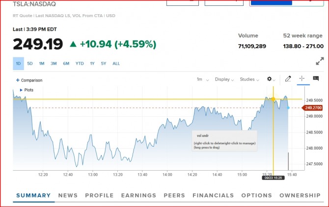 테슬라의 올해 3분기(7∼9월) 전기차 인도량 실적이 시장 예상치를 웃돌 것이란 전망이 뉴욕증시에서 나오면서테슬라 주가가 급등하고 있다. 테슬라 주가는 지난 18일 미 연방준비제도(Fed)의 기준금리 인하 이후 19일 7.4% 급등했다가 20일에는 2.3% 하락한 바 있다. 투자은행 바클레이스의 애널리스트 댄 레비는 이날 테슬라의 3분기 인도량이 약 47만대에 달할 것으로 예상했다.