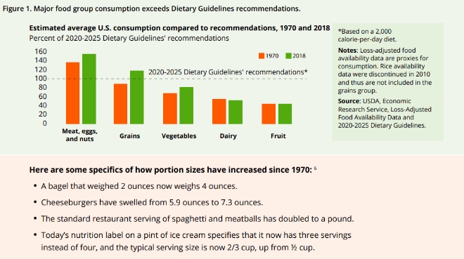 실제로 미국 조지타운대 경영대학원 부설 연구소 ‘음식 분량 균형찾기 동맹(Portion Balance Coalition)'이 최근 펴낸 보고서에 따르면 지난 1970년과 지난 2018년 사이에서 늘어난 미국인들이 소비하는 음식의 양을 조사한 결과 미국인들이 흔히 먹는 빵의 일종인 베이글의 경우 개당 중량이 2온스(약 57g)에서 4온스(약 113g)로 배나 늘었다.