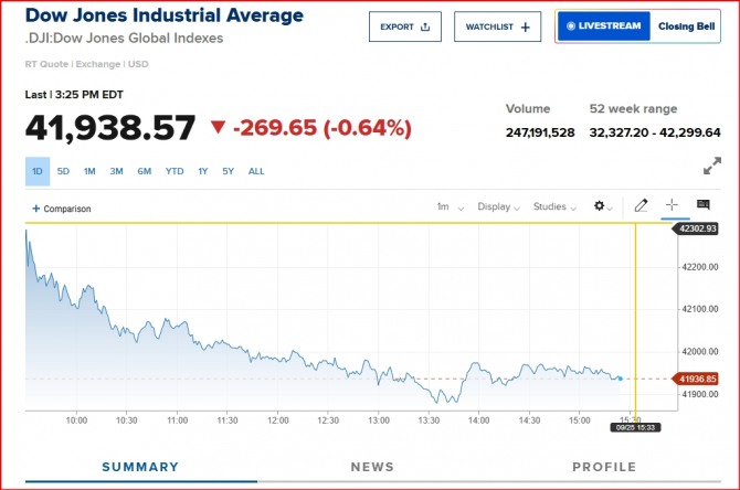 유럽증시는 하락세다. 독일 DAX지수는 0.53%, 영국 FTSE지수는 0.32%, 범유럽지수 STOXX600은 0.23% 각각 밀렸다. 국제 유가도 내림세를 나타냈다. 엔비디아의 젠슨 황 최고경영자(CEO)가 주식 매도 계획을 일찍 완료했다는 소식 등에 주가가 크게 올랐다. CNBC와 마켓워치는 젠슨 황 CEO가 엔비디아 주식 600만주를 평균 118.83달러에 매도해서 총 7억1300만달러(약 9천500억원)를 손에 쥐었다고 보도했다. 젠슨황의 매도 기간은 6월 14일부터 9월 13일까지 약 3개월이었다. 젠슨황의 주당 매도 가격은 91.72달러(8월 5일)에서 140.24달러(6월 20일) 사이였다.