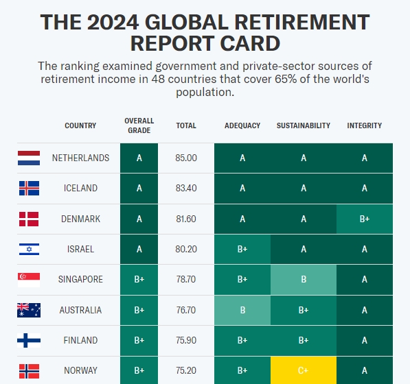 2024년 머서 연금지수 보고서…네덜란드·아이슬란드·덴마크·이스라엘 A학점, 인도·아르헨티나·필리핀·튀르키예·남아공 D학점
