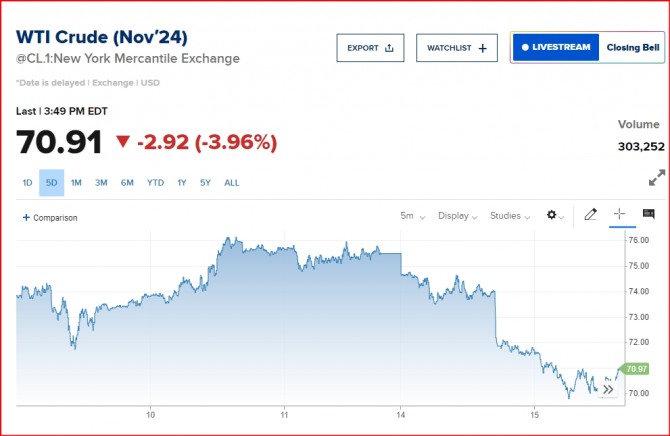 중동 위기 고조에 급등했던 국제유가는 연일 급락하고 있다. 미국의 석유 수요가 둔화할 것이라는 전망과 함께 이스라엘의 이란 석유 시설 공격 우려가 줄면서다. 유가 하락에는 중국의 경기 부양책에 대한 실망감과 석유수출국기구(OPEC)의 수요 증가폭 예측치 하향 등이 영향을 미쳤다. 중국 재정부는 지난 12일 기자회견에서 경기 부양을 위해 국채 발행을 대폭 늘릴 계획이라면서도 발행 규모를 공개하지 않았다. 세계 최대 원유 수입국인 중국의 수입 규모는 9월까지 전년 동기 대비 5개월 연속 감소했다. 석유수출국 기수 OPEC은 올해 수요 증가폭 전망치를 기존 하루 200만 배럴에서 190만 배럴로 낮췄다.