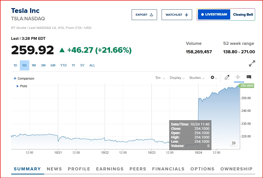 이미지 확대보기25일 뉴욕증시에 따르면 테슬라 주가는 머스크 말 한마디 이후 크게 오르고 있다. 지난달 9월30일 261.63달러(종가 기준)까지 상승했던 테슬라 주가는 이달 10일 로보택시 공개 행사 직후 실망스럽다는 평가가 주를 이루면서 다음 날 8.8% 급락했고 실적 발표 당일인 23일 213.65달러까지 하락해 거래를 마감한 바 있다. 이날은 테슬라가 전날 장 마감 후 발표한 3분기 실적은 시장의 예상치를 뛰어넘는 '어닝 서프라이즈'로 평가됐다.