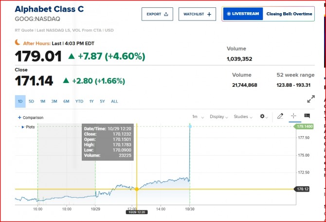 이미지 확대보기구글 알파벳 주가가 정규잠 마감 직후 시간후거에에서 급등하고 있다. 뉴욕증시 깜짝 실적발표가 주가를 폭발시키고 있다. 세계 최대 검색 엔진 업체 구글의 3분기(7∼9월) 매출과 주당 순이익이 모두 시장 예상치를 웃돌았다.구글 알파벳 의 매출과 주당 순이익 등이 뉴욕증시 예상치 초과하면서 "어닝 서프라이즈 "를 기록한 것이다.