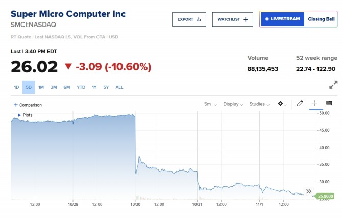 이미지 확대보기2일 뉴욕증시에 따르면 인공지능 반도체 대장주 엔비디아 동맹 슈마컴(SMCI) 회계조작 사건이 일파만파로 확대되고 있다. 뉴욕증시에서는 앤비디아 반도체 동맹인 슈마컴에 대해 법무부 가 긴급 수사를 하고 있다는 보도가 나오고 있다. 이같은 보도에 뉴욕증시는 물론 비트코인 이더리움 리플등 가상 암호화폐와 달러환율 국채금리 국제유가 금값 등도 요동치고 있다. 월스트릿저널은 미국 법무부가 슈마컴에 대해 수사를 하고 있다고 보도했다. 혐의는 회계부정이다,