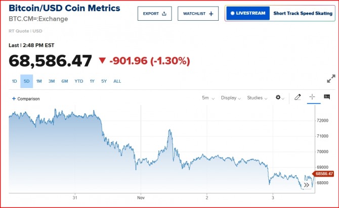 이미지 확대보기4일 뉴욕증시에 따르면 미국 대선을 앞두고 도널드 트럼프 후보의 당선 가능성이 낮다는 전망이 지속해서 제기되며 비트코인 가격도 하락세를 보이고 있다. 국내 가상자산 거래소 업비트 기준 비트코인 가격은 1억달러선이 무너졌다. 뉴욕 가상화폐거래소에서도 코인마켓캡 기준 비트코인 가격이 내리고 있다. 불과 며칠 전 7만3000달러를 돌파했던 비트코인 가격이 현재 6만8000달러 선까지 내려왔다.