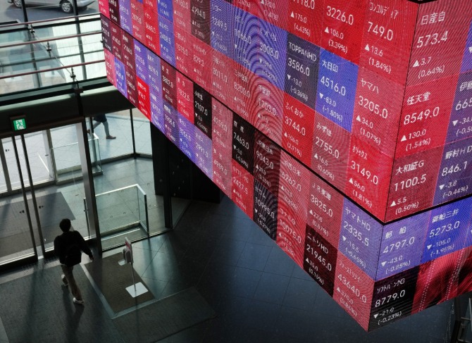 일본 도쿄의 도쿄 주가 지수를 보여주는 디스플레이를 보행자들이 지나가고 있다. 사진=연합뉴스