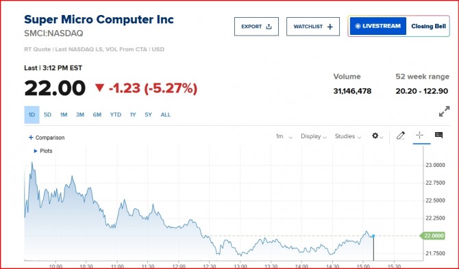 이미지 확대보기13일 뉴욕증시에 따르면 미국 서버 제조업체 슈퍼마이크로컴퓨터(SMCI)가 부정회계 논란과 실망스러운 실적 속에 주가가 폭락하는 가운데 나스닥에 제출해야 하는 보고서까지 기한을 못 지키면서 끝내 상장 폐지로 치닫고 있다. SMCI는 올해 8월에 제출했어야 할 연례 10-K 보고서를 아직 제출하지 못했다.