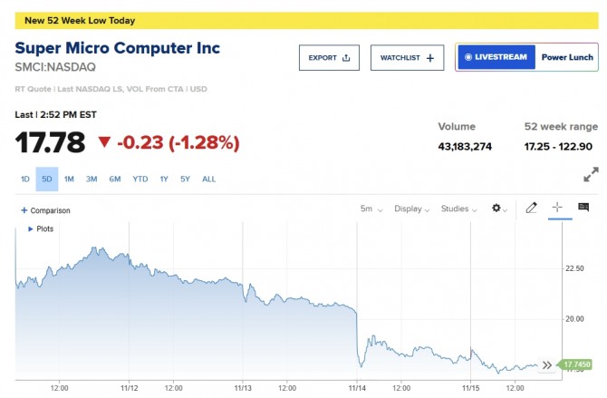 회계 조작 의혹이 커지면서 주가는 폭락하고 있다. 2024년 한때 122.9달러까지 급등했던 것에 비해 주가는 85% 폭락했다. 슈퍼마이크로는 AI 칩 대장주 엔비디아의 최신 AI 칩을 장착한 서버를 제조하며 AI 열풍과 함께 큰 주목을 받았다.주가는 2022년 말부터 올해 3월 정점까지 14배 이상 급등했다.