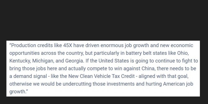 이 단체는 이어 "미국이 이러한 일자리를 가져오고 실제로 중국과의 경쟁에서 승리하기 위해 계속 싸워나가려면 그 목표와 일치된 '청정 차량 세금 공제' 같은 수요 신호가 있어야 하고, 그렇지 않으면 그런 투자를 저하하고 미국의 일자리 성장을 해칠 것"이라며 제도 유지를 촉구했다. ZETA 홈페이지에는 이 단체가 전기차 보급을 촉진하고 탄소 배출로 인한 오염을 크게 줄이는 정책을 제정하기 위해 노력하는 연합 단체라고 소개돼 있다. 여기에는 한국 기업 LG를 비롯해 파나소닉, 미국 전기차업체 리비안과 루시드, 테슬라, 전기차 충전기업체 EVgo, 미국의 전기회사 에디슨 등이 회원으로 등재돼 있다.