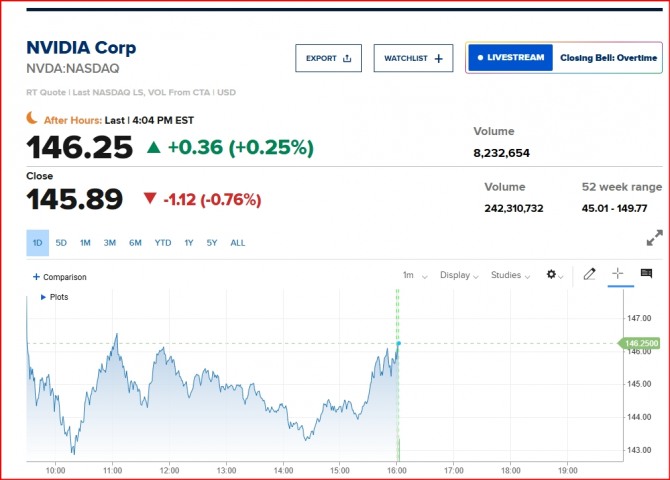 매출은 시장조사업체 LSEG가 집계한 월스트리트 예상치 331억6천만 달러를 웃돌고, 주당 순이익도 예상치 0.75달러를 상회하는 수준이다. 이날 뉴욕 증시 정규장에서 0.76% 내린 엔비디아 주가는 실적 발표 직후하락 중이다. 뉴욕증시는 세간의 이목이 쏠린 엔비디아의 실적 발표를 앞두고 큰 변동성을 보인 끝에 혼조로 마감했다. 뉴욕증권거래소(NYSE)에서 다우존스30산업평균지수는 전장보다 139.53포인트(0.32%) 오른 43,408.47에 거래를 마감했다. 스탠더드앤드푸어스(S&P)500지수는 전장보다 0.13포인트(0.00%) 오른 5,017.11, 나스닥종합지수는 21.33포인트(0.11%) 내린 18,966.14에 장을 마쳤다.