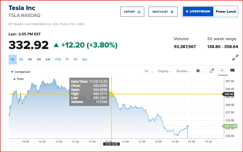 테슬라 주가는 미 대선일이었던 지난 5일 251.44달러이었다. 그러나 트럼프 전 대통령 당선 이후 급등하며 지난 11일에는 350달러까지 껑충 뛰었고, 이후 숨 고르기에 들어갔다.