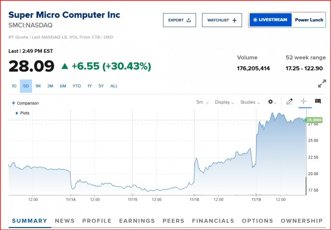 이미지 확대보기20일 뉴욕증권거래소에 따르면, 연례 보고서 제출 지연으로 나스닥 퇴출 위기에 몰린 미국의 서버 제조업체 슈퍼마이크로컴퓨터(이하 슈마컴 ) 주가가 폭등하고 있다. 그 전날 15.93% 급등 마감한 데 이어 이틀간 50% 치솟았다.