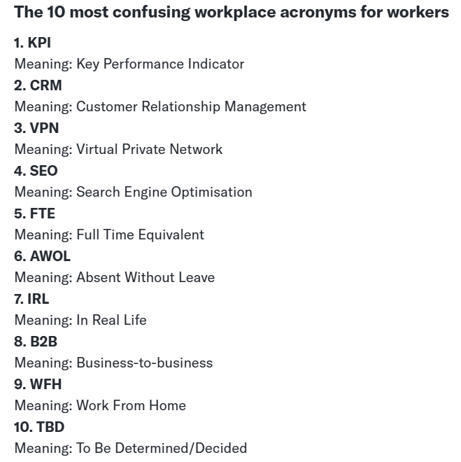 이밖에 Z세대 직장인들이 이해하기 어려워 상당한 스트레스를 느끼고 있는 용어로는 △‘customer relationship manage'의 준말로 기업이 고객을 관리하기 위해 필요한 방법론이나 소프트웨어 등을 가리키는 말인 CRM △‘virtual private network’의 약자로 사설망에 연결된 것처럼 인터넷에 연결될 수 있도록 하는 ‘가상 사설망’을 뜻하는 VPN △'search engine optimization'의 준말로 인터넷 웹사이트가 검색 결과에 더 잘 보이도록 최적화하는 ‘검색 엔진 최적화’를 말하는 SEO △‘full time equivalent'의 약칭으로 회사 직원이 풀타임으로 일한 총 시간 수를 나타내는 ’풀타임 등가물‘을 뜻하는 FTE △'absent without leave'의 약자로 무단 결근을 뜻하는 AWOL △'in real life'의 준말로 ‘현실에서’ 또는 ‘현실 세계에서’라는 뜻의 IRL △'business-to-business', 즉 기업과 개인 소비자 간 거래가 아닌 기업 간 거래를 의미하는 B2B △아직 미정이라는 말인 ‘to be determined' 또는 'to be decided’의 약자 TBD △전례 없는 신종 코로나바이러스 사태로 널리 확산된 근무 방식인 재택근무(work from home)의 준말 WFH 등이 있는 것으로 조사됐다.