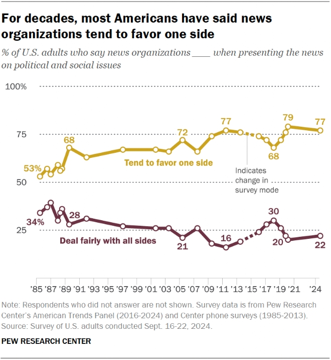 이미지 확대보기4일(이하 현지시각) 더힐에 따르면 여론조사업체 퓨리서치센터가 최근 미국민을 대상으로 조사를 벌인 결과 응답자의 77%가 미국 언론사가 사회 문제와 정치적 사안을 다루면서 공정한 보도를 하지 않고 있다고 느끼는 것으로 나타났다.