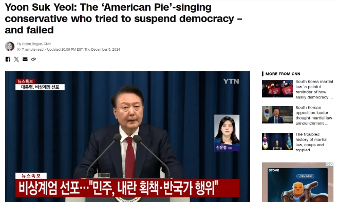 CNN은 지난해 미국 백악관을 찾은 자리에서 미국인들이 보는 가운데 가수 돈 매클린의 ‘아메리칸 파이’를 부르면서 굳건한 한미동맹 관계를 과시했던 그가 한국의 민주주의를 파괴하려 비상계엄을 강행하는 데 실패한 뒤 이제는 내란 수괴라는 비난을 받는 존재로 전락해 충격을 주고 있다고 지적했다.