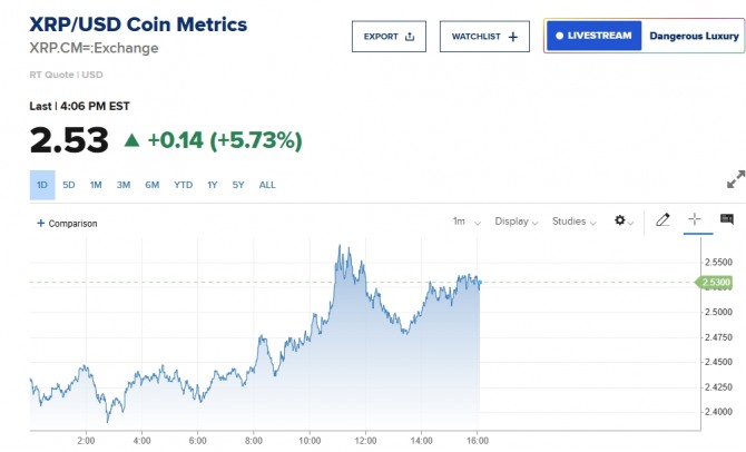 이미지 확대보기8일 뉴욕증시와 가상화폐 업계에 따르면 리플(XRP)은 테더를 제치고 다시 3위에 올라섰다. 비트코인 이더리움 다음의 순위까지 차지한 것이다. 테더 솔라나 BNB등이 리플보다 아래 순위에 있다. 베스트 5에 속한 코인중에서는 가장 상승률이 높다