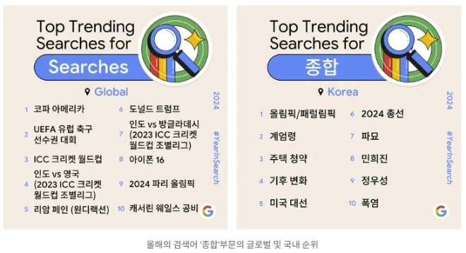 구글은 “지난해에 올해의 경우도 K-콘텐츠와 K-팝의 글로벌 영향력을 다시 한번 확인할 수 있었다”면서 “특히 2024년은 새로운 K-팝 곡과 다채로운 K-콘텐츠가 대거 공개되면서 국내뿐 아니라 해외에서도 한국 콘텐츠에 대한 열풍이 이어진 한 해였다”고 평가했다.