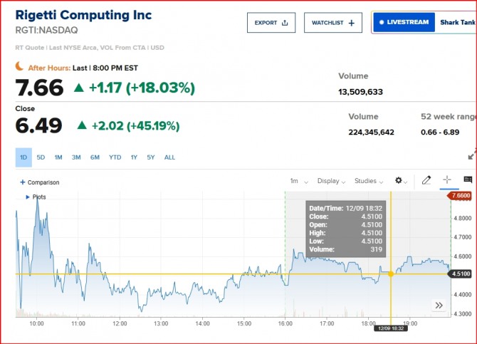 이미지 확대보기11일 뉴욕증시에 따르면 리게티 컴퓨팅은 무려 45.40% 치솟은 6.4994달러에 장을 마쳤다. 리게티는 그에 앞서 지난달 25일에도 58.05% 급등하는 등 올해 들어 주가는 570% 이상 올랐다.