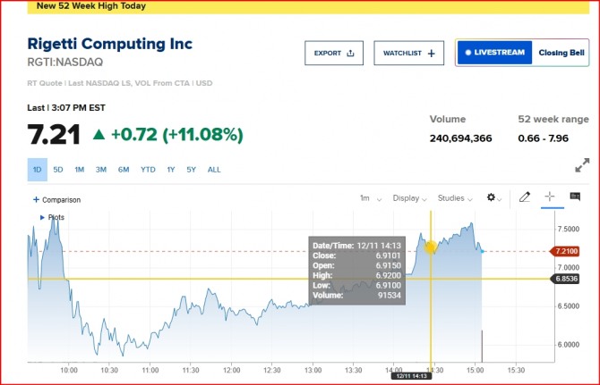 12일 뉴욕증시에 따르면 양자컴퓨팅 회사 리게티 컴퓨팅(RGTI) 주가가 구글의 혁신 발표 이후 연일 급등 폭발하고 있다. 뉴욕증시에서 리게티는 전날 45% 오른 후 이날 또 11%오르고 있다. 리게티는 그에 앞서 지난달 25일에도 58.05% 급등하는 등 올해 들어 주가는 600% 이상 올랐다. 리케티는 양자 컴퓨팅을 활용한 반도체 제작에 가장 앞서있는 것으로 평가받고 있다. 뉴욕증시에서는 리케티를 미래의 엔비디아로 부르고 있다.