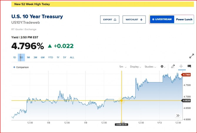 이미지 확대보기14일 뉴욕증시에 따르면 글로벌 시장금리 벤치마크인 미국 10년물 국채 금리는 10일 장중 4.8에 육박 심리적 저항선인 5%에 한 발 더 다가섰다. 1월 8일 장중 4.73%로 지난해 4월 이후 최고치를 찍은 데 이어 다시 한번 고점을 높인 것이다. 10년물 국채 금리는 2023년 10월 19일 당시 4.987%를 찍은 바 있다. 국채 금리 상승에는미국의 비농업 일자리 지표 호조, 기대 인플레이션 상승 등이 영향을 끼쳤다. 곧 발표될 소비자물가지수(CPI)도 국채 금리에 영향을 미칠 수 있는 요인이며, 5% 금리가 '뉴노멀'이라는 평가도 나온다.