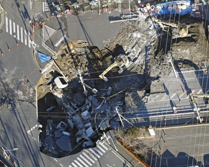 도쿄 북쪽 사이타마현 야시오시에서 발생한 싱크홀은 초기에는 대략 지름 10m였다.