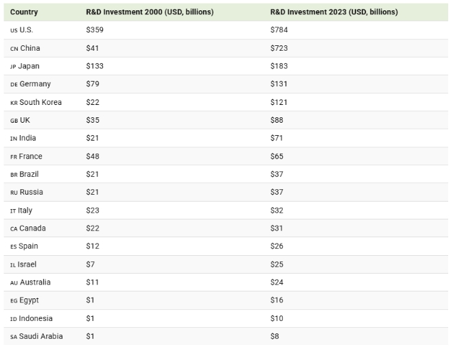2023년 기준으로 미국은 전 세계 R&D 지출의 약 28.5%를 차지하며 1위를 유지했지만 중국은 26.3%로 그 뒤를 바짝 추격하고 있다. 두 나라의 R&D 지출 격차는 610억 달러(약 84조5000억 원)에 불과하다. 이는 2000년 당시 미국이 전체의 36%를 차지하고, 중국이 4%에 불과했던 것과 비교하면 괄목할 만한 변화다.