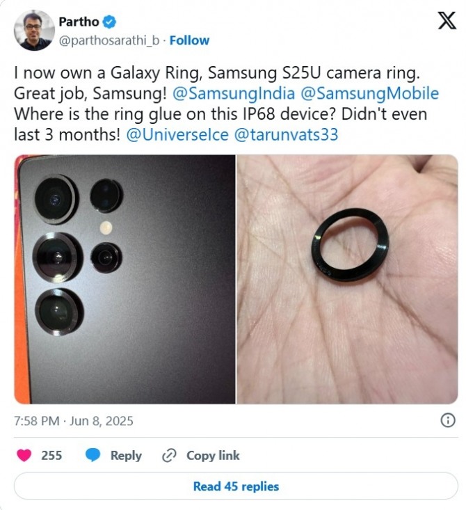 보도에 따르면, 한 사용자는 소셜미디어 X를 통해 "갤럭시 S25 울트라를 석 달간 매일 쓴 뒤 카메라 링 하나가 떨어져 나갔다"고 밝혔다. 이 사용자는 외부 충격이나 손상 없이 부품이 분리되었다고 주장했다.