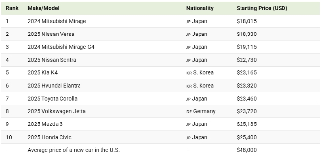 미국의 시장정보 조사업체 비주얼캐피털리스트는 자동차 전문지 카앤드라이버가 최근 낸 자료를 인용해 “2025년 기준 미국에서 가장 저렴한 신차 10종 가운데 9종이 아시아 브랜드이며 이 가운데 2종은 한국 브랜드”라고 14일(현지시각) 전했다.