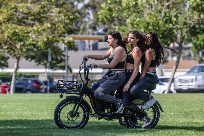 미국 캘리포니아주 어바인에서 세 사람이 전기자전거를 타는 모습. 사진=LAT
