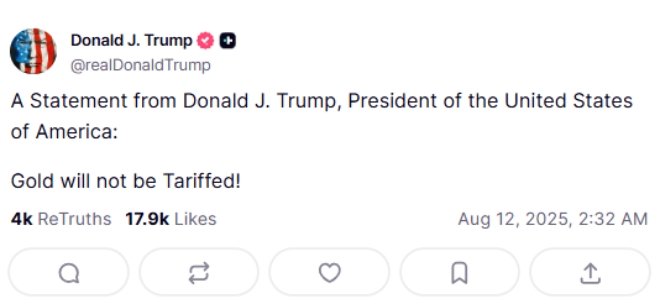 트럼프 대통령은 이날 자신의 소셜미디어 트루스소셜을 통해 “금에 관세를 부과하지 않을 것”이라고 발표했다. 트럼프는 지난주 미국 세관국경보호국(CBP)이 금 수입에 관세를 매길 수 있다고 알린 내용을 공식 부인하며 이같이 밝혔다.