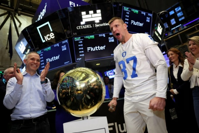 팬듀얼의 모회사 플러터의 피터 잭슨과 전미프로축구(NFL) 스타 출신 롭 그론카우스키가 2024년 1월 뉴욕증권거래소에서 열린 회사 상장 행사에서 포즈를 취하고 있다. 사진=로이터이미지 확대보기