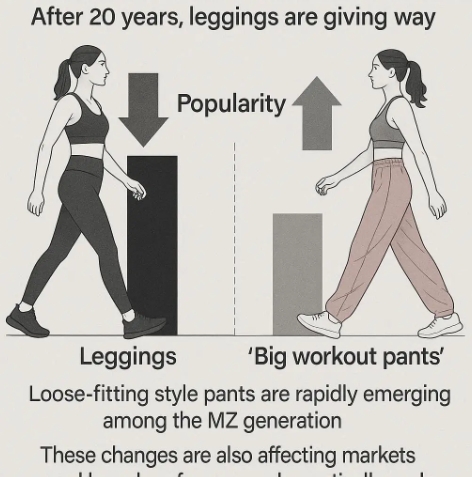 전문가들은 “레깅스 인기가 줄고 헐렁한 빅 팬츠가 뜨는 것은 자연스러운 소비 심리와 시장 흐름 변화 때문”이라고 말한다. 한국 시장에서도 레깅스 대신 다양한 핏과 스타일의 바지가 인기를 얻으며 브랜드들이 경쟁하는 분위기다.