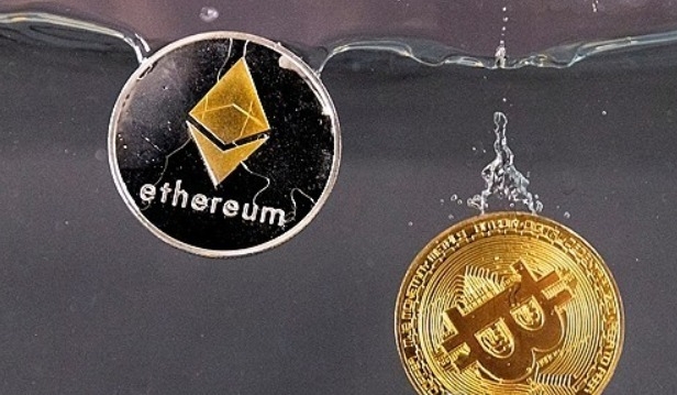 비트코인과 이더리움 기념품 토큰이 물에 빠지고 있다.     사진=로이터/연합뉴스이미지 확대보기