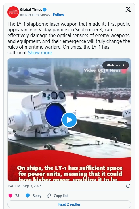 ◇ 중국 LY-1, 함정용 고출력 레이저 무기로 데뷔