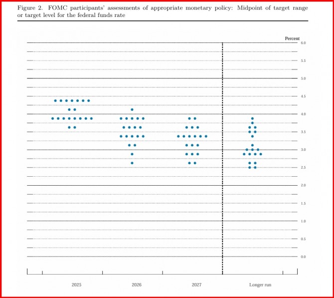 금리전망 점도표는 FOMC 투표권을 보유하지 않은 지역 연방준비은행(연은) 총재를 포함해 모두 19명의 위원이 익명으로 의견을 제시한다. 뉴욕증시 시장의 관심사는 자연스레 연준이 추가 금리 인하의 시기와 폭에 관해 어떤 신호를 보낼지로 쏠렸다. 도널드 트럼프 미 행정부의 관세 정책 불확실성이 지속되는 가운데 경제 전문가들은 연준이 노동시장 약화 위험과 인플레이션 반등 위험 중 어느 쪽에 더 무게 중심을 둘지를 두고 치열한 논쟁을 벌여왔다.