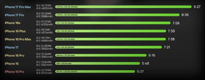 중국의 IT 저널리스트 기커완이 진행한 별도 테스트에서도 아이폰17 프로 맥스는 전작 대비 약 2시간 더 긴 배터리 수명을 보여줬다. 특히 기본형 아이폰17도 아이폰16 프로 맥스에 근접한 사용 시간을 기록해 전체 라인업에서 배터리 성능 향상이 뚜렷하게 나타났다는 평가다.
