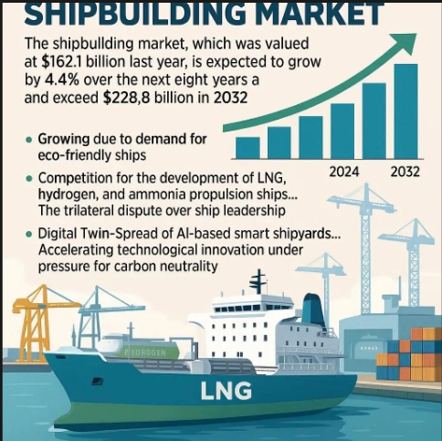지역별로는 아시아태평양 지역이 글로벌 조선시장을 압도하고 있다. 보고서는 한국, 중국, 일본이 벌크선, 컨테이너선, 유조선 등 대량 생산뿐 아니라 LNG 운반선 같은 고부가가치 선박과 친환경 기술 혁신에서도 앞서 있다고 분석했다. 이들 3국은 성숙한 조선소 기반시설, 숙련된 인력, 정부 지원, 규모의 경제 등에서 강점을 보이고 있다.