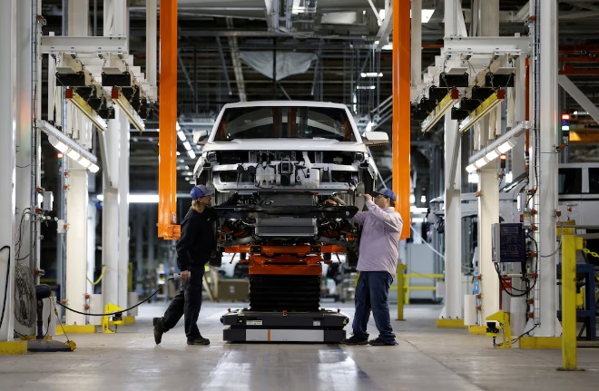 지난 2022년 11월 30일(현지시각) 미국 오하이오주 로즈타운의 폭스콘 전기차 생산공장에서 근로자들이 완성되지 않은 로즈타운 모터스의 전기 픽업트럭 ‘인듀어런스’를 조립하고 있다. 사진=로이터이미지 확대보기