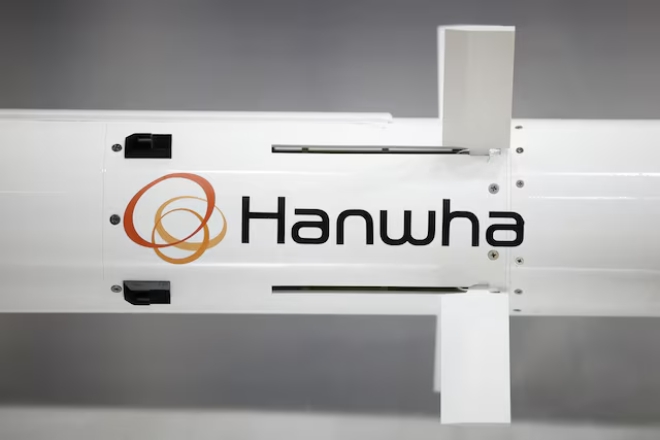 지난해 6월 17일(현지시각) 프랑스 빌팽트에서 열린 ‘유로사토리(Eurosatory)’ 국제 육·공방위산업 전시회에 설치된 한화오션 부스의 로고. 사진=로이터이미지 확대보기