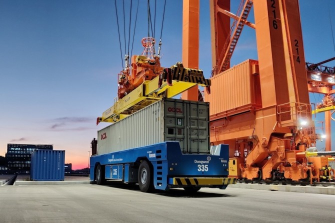 부산 신항 7부두는 동북아 최대 물동량을 처리하는 핵심 터미널이자 북극항로 수송 전초기지로 부상하고 있다. DGT는 2023년 AGV 43대를 도입해 자동화 운영을 시작했으며, 지난해 터미널운영시스템(TOS)과 디지털 트윈 기반 전면 자동화 시험을 마쳤다. 업계 관계자는 “고빈도 컨테이너 작업 처리에는 AGV 수평 이송 시스템이 필수”라고 말했다.